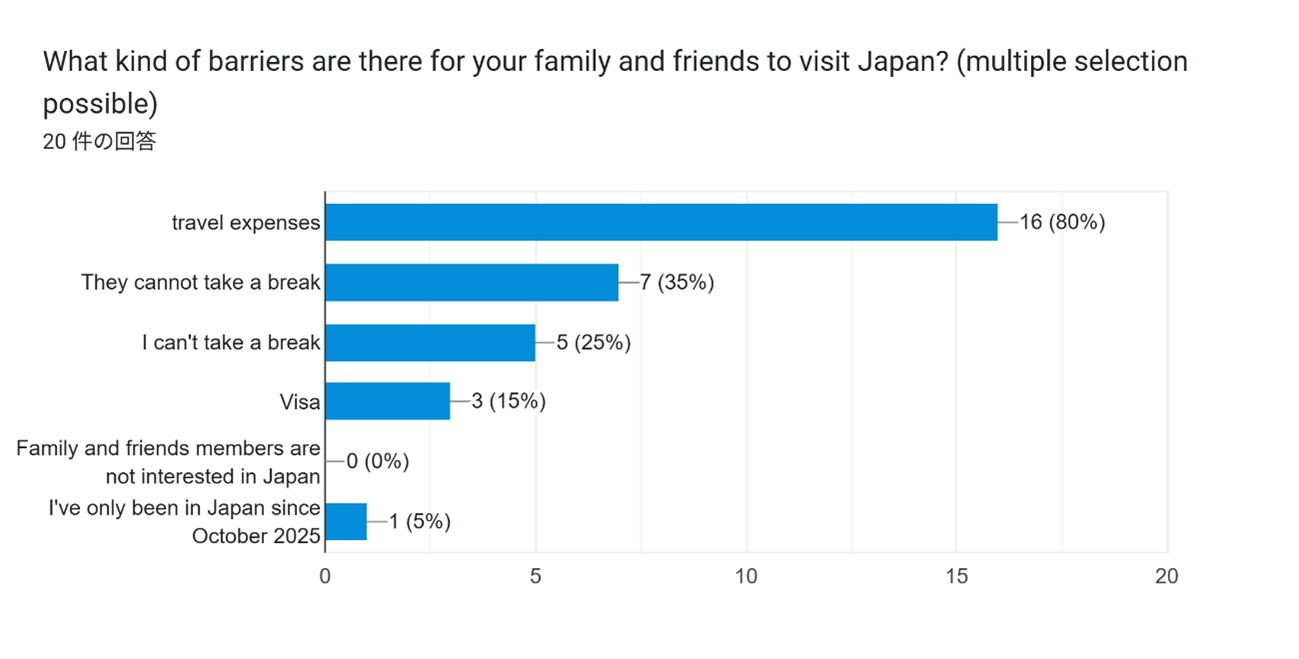 - 家族が来日していない層において、「travel expenses(旅費)」が最大の障壁(80%)として挙げられている。