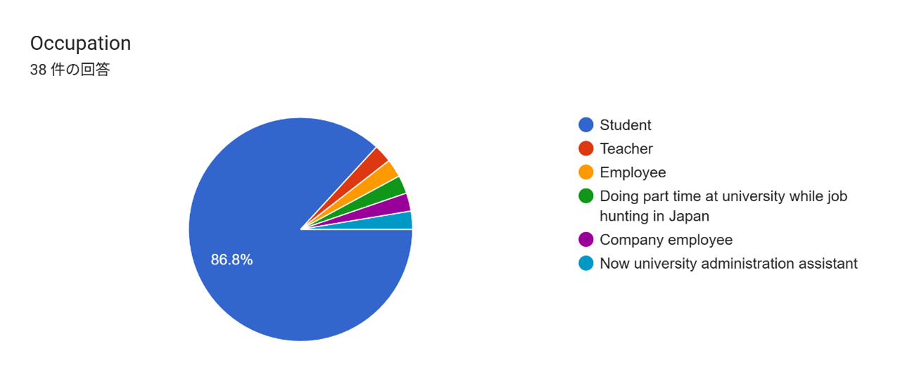 | 回答者国籍 | 16ヵ国(中国、ベトナム、インド、ウズベキスタン、フィリピン、インドネシア、イラン、マダガスカル、シリア、コロンビア、キルギス、メキシコ、マレーシア、パキスタン、タジキスタン、バングラデシュ) |