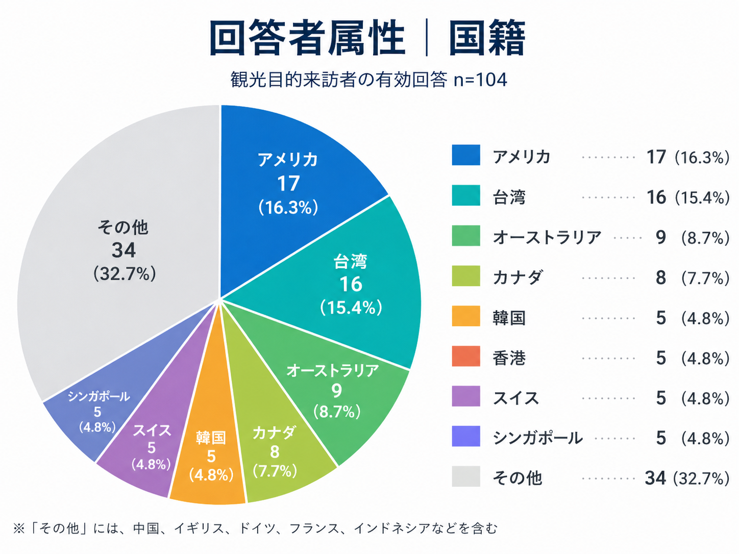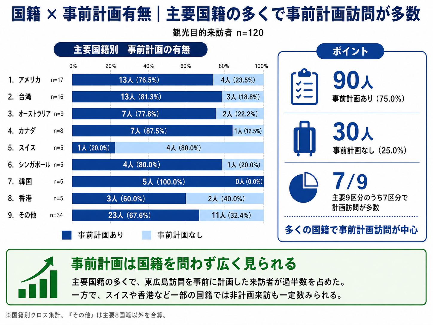 ・一方で、香港では約6割、中国では約5割にとどまり、スイスでは非計画来訪者の割合が高い傾向が見られました。ただし、これらの国籍はサンプル数が少ないため、傾向の解釈には留意が必要です。
