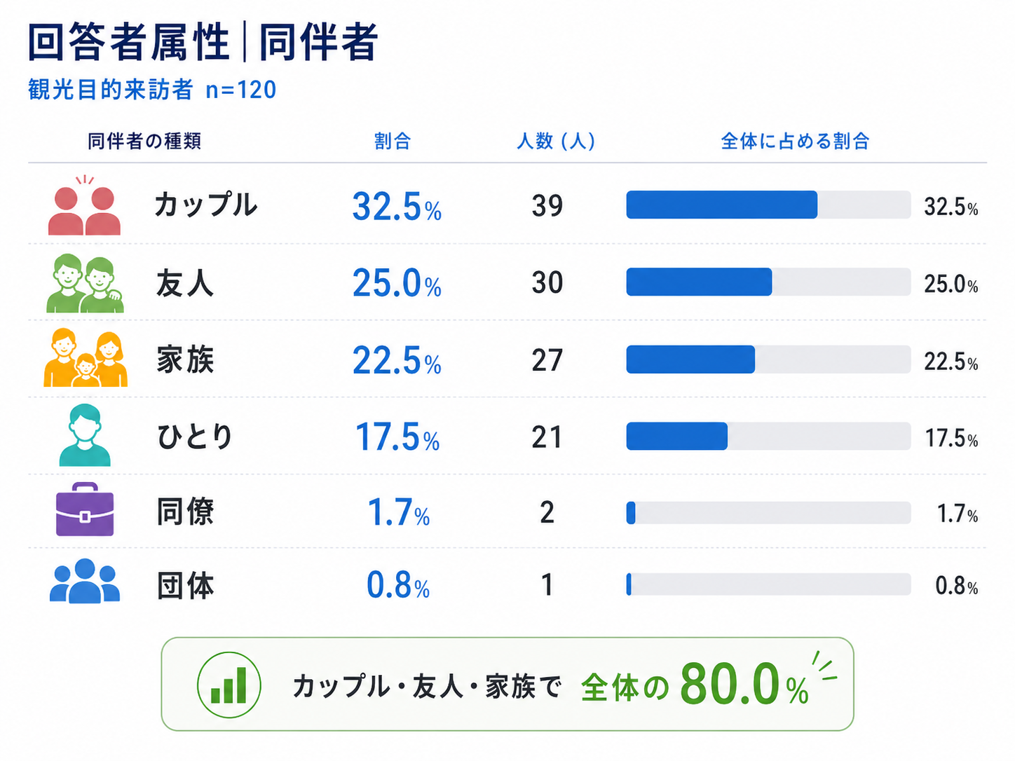 ・一方で、30人(約25%)は事前計画がないまま来訪しており、東広島市が計画的な目的地であると同時に、偶発的に選ばれる観光地でもあることがうかがえます。