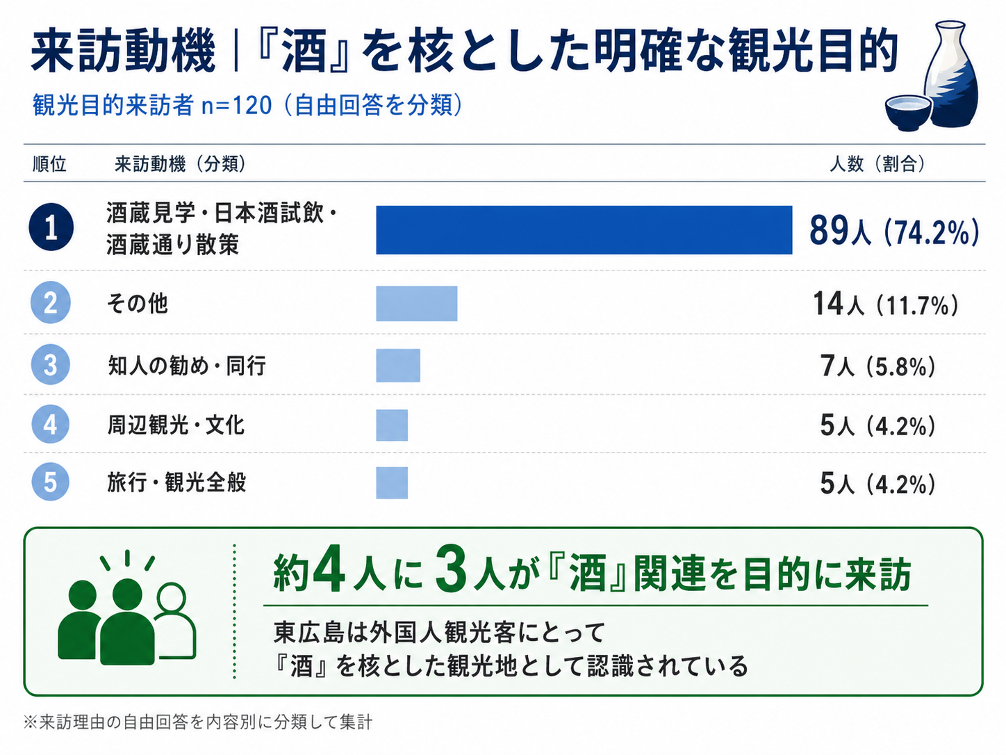 ・観光目的で来訪した120サンプルの来訪理由を見ると、酒蔵見学、日本酒試飲、酒蔵通り散策に関する回答が多くを占めていました。