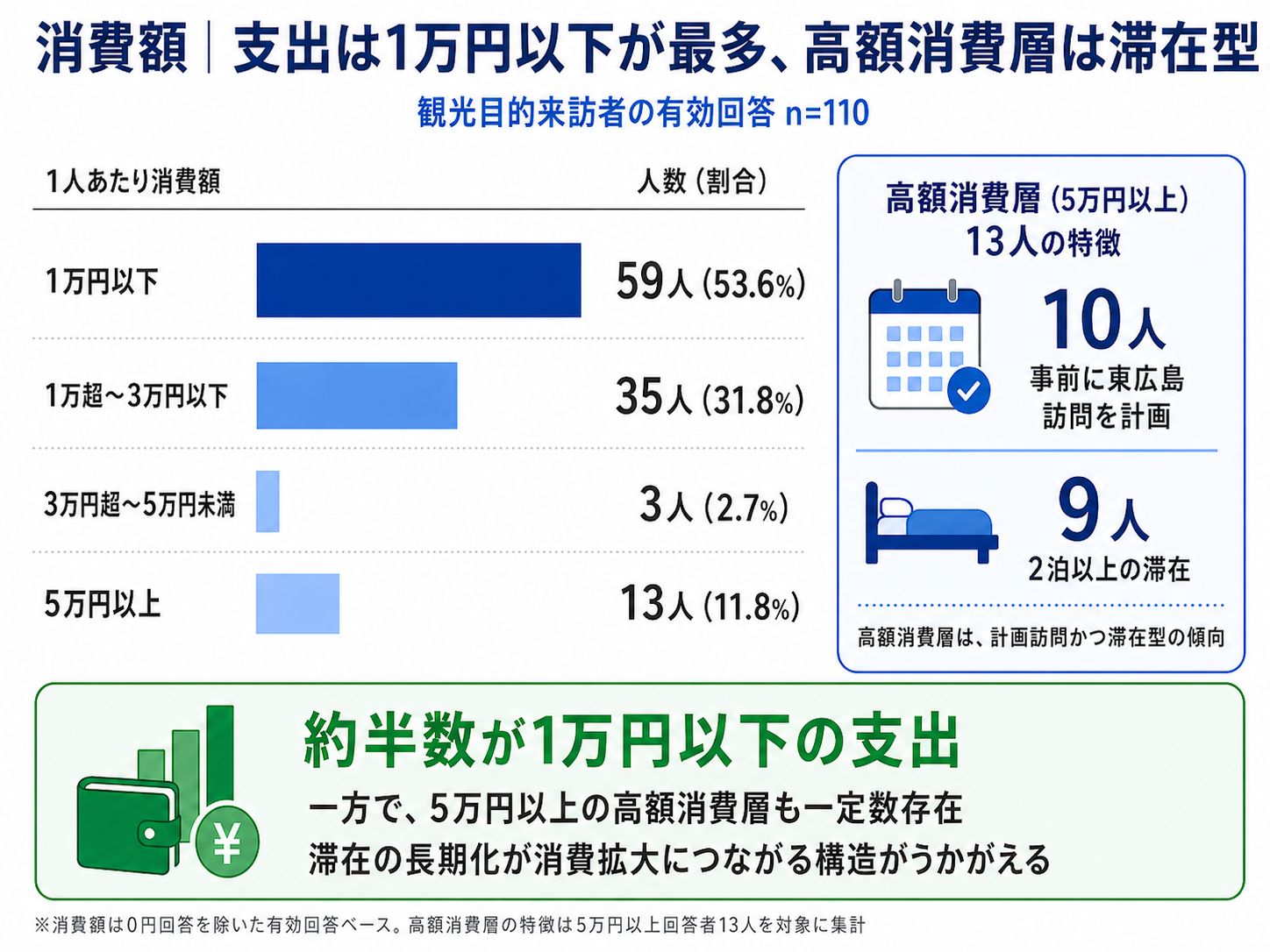 ・一方で、5万円以上を支出した来訪者も13人確認されており、このうち、10人が事前に東広島市訪問を計画していた来訪者であり、また2泊以上の滞在者が全体の約7割を占めていました。