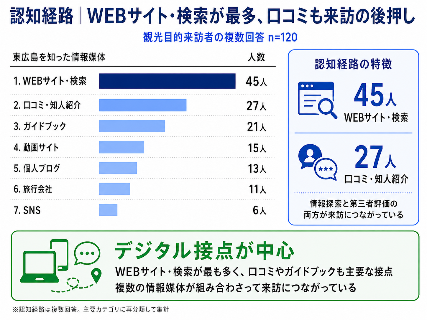 ・また、Webサイトの具体名としてはGoogle検索や旅行予約サイト等が挙げられており、デジタル接点が訪問計画の形成において重要な役割を果たしていると考えられます。