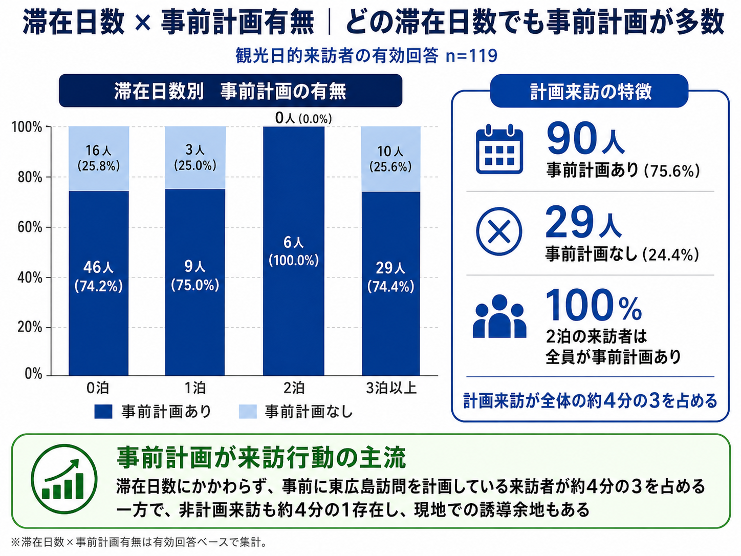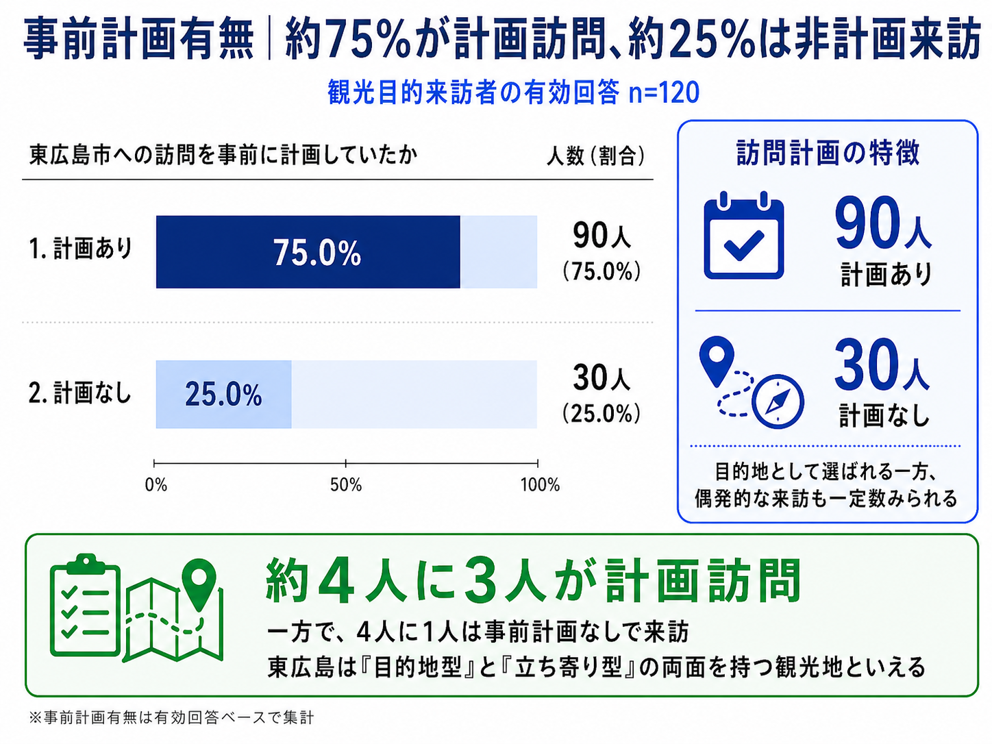 ・観光目的で来訪した120サンプルのうち、90人(約75%)が事前に東広島市を訪問する計画を立てていました。
