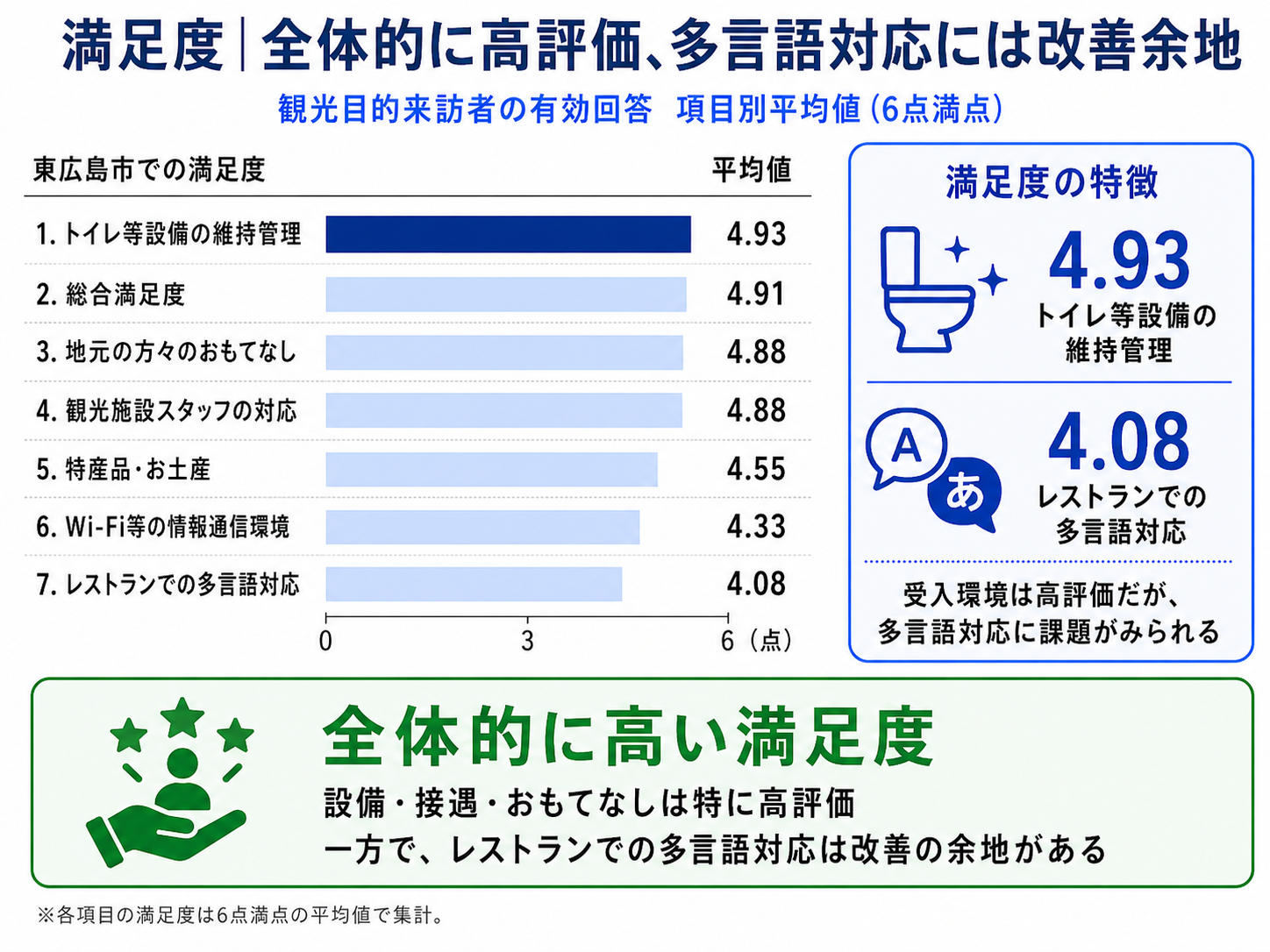 ・一方で、「レストランでの多言語対応」は平均4.08と相対的に低く、外国人観光客向けの情報・対応面においては、引き続き改善の余地があることがうかがえます。