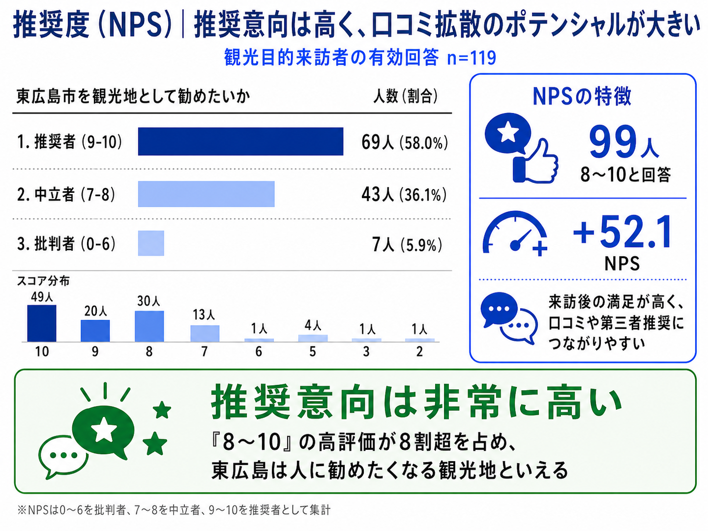 ・このことから、東広島市は来訪後の満足度が高く、口コミや第三者推奨につながりやすい観光地であることがうかがえます。