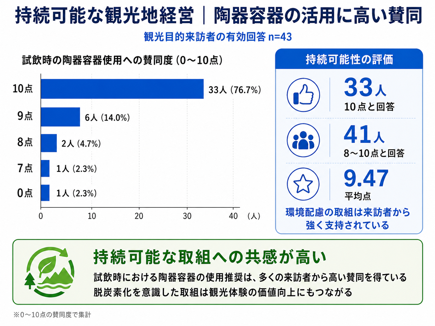・持続可能な観光地経営に向けた取り組み(試飲時における陶器容器の使用推奨)については、「強く賛同する(10)」と回答した来訪者が大多数を占めていました。