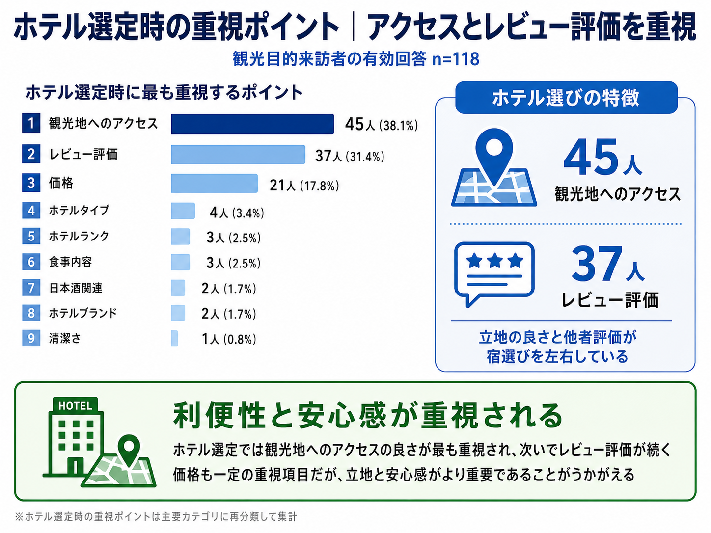 ・ホテル選定時に重視するポイントとしては、観光地へのアクセスの良さが最も多く、次いでレビュー評価が挙げられていました。