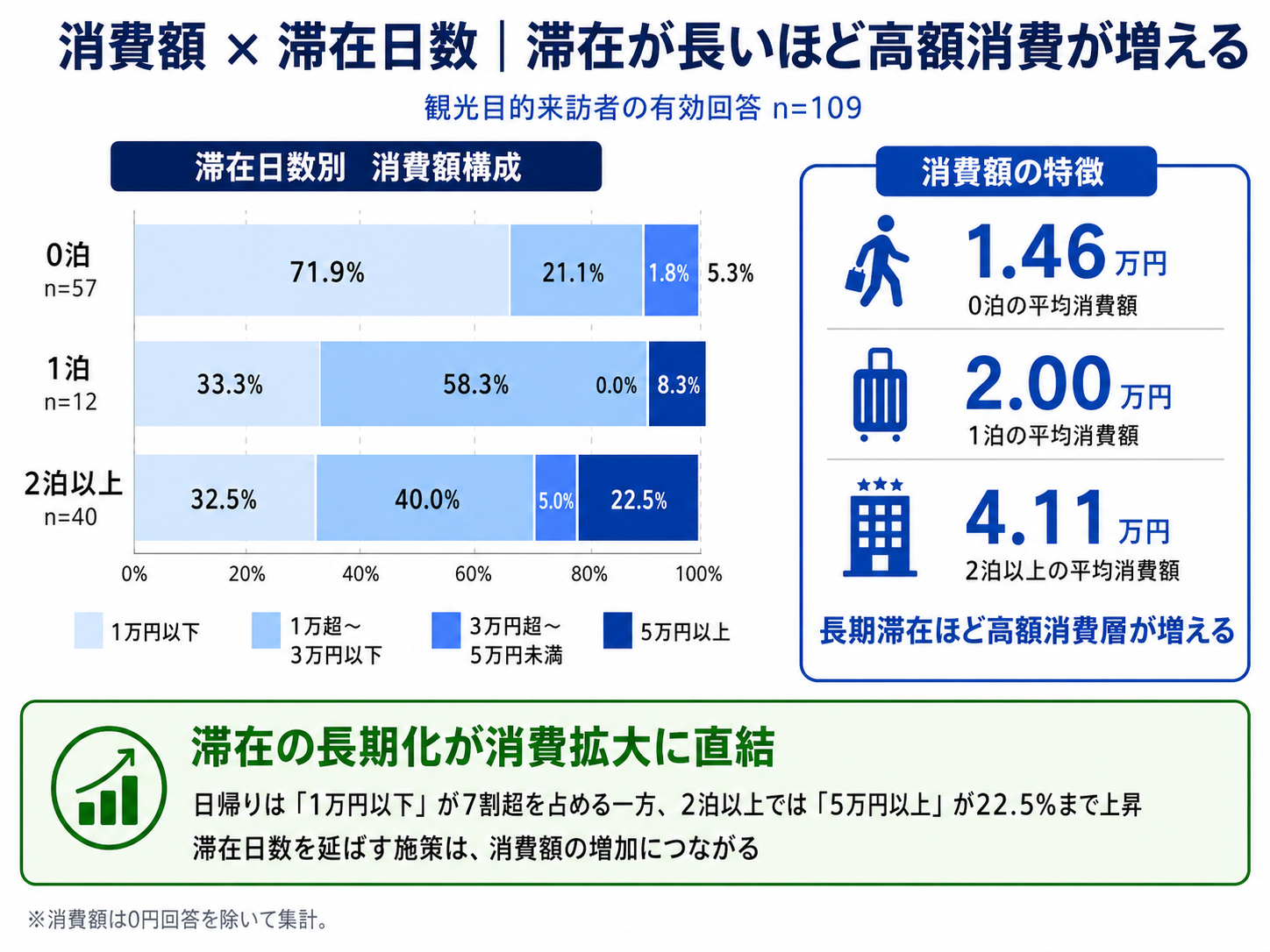 ・観光目的来訪者の滞在日数別に一人当たり平均消費額を見ると、日帰り(0泊)では約1.46万円にとどまる一方、2泊以上の滞在では消費額が大きく増加する傾向が確認されました。