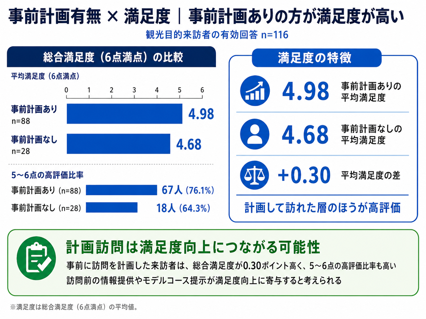 ・一方で、事前計画なしで来訪した層においても一定の満足度は確保されているものの、評価にはややばらつきが見られ、来訪前の情報量や行動イメージの有無が体験の質に影響している可能性がうかがえます。