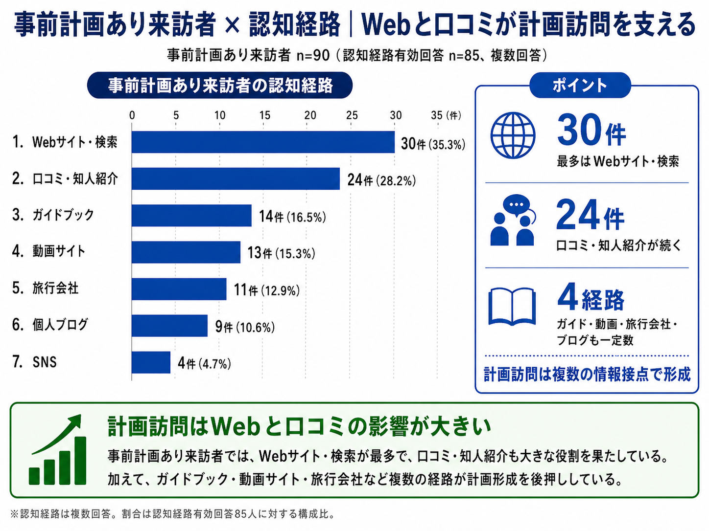 ・このことから、計画訪問者は特定の単一媒体ではなく、Web検索を中心に、口コミや紙媒体、動画、旅行会社など複数の情報源を組み合わせながら訪問先を検討していることがうかがえます。