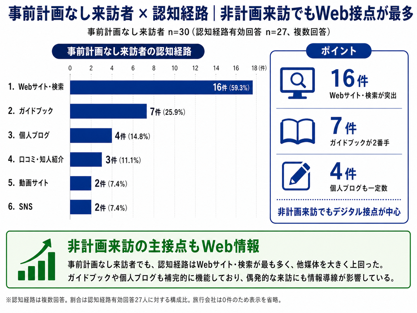 ・Webサイト・検索が16件(59.3%)と最も多く、他の媒体を大きく上回りました。次いで、ガイドブックが7件(25.9%)、個人ブログが4件(14.8%)、友人・家族等の口コミが3件(11.1%)となっています。