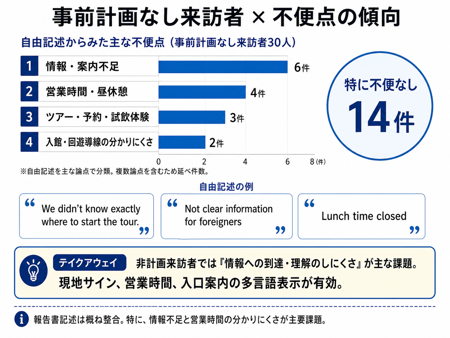 ・酒蔵通り周辺観光における不便点としては、「どこから観光を始めればよいか分からない」「外国人向けの情報が分かりにくい」といった声が見られました。