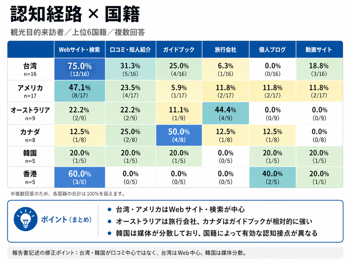 ・一方で、オーストラリアでは旅行会社、カナダではガイドブックの比率が相対的に高く、国籍によって主な認知経路に違いが見られました。