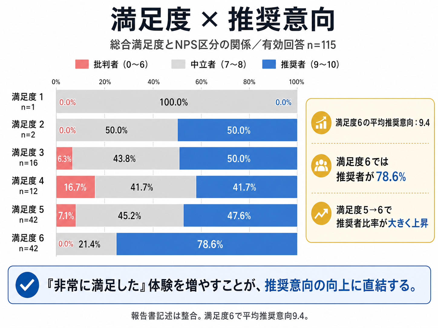 ・総合満足度と推奨意向の関係を見ると、満足度が6の来訪者では、平均推奨意向が9.4と特に高い水準となっていました。