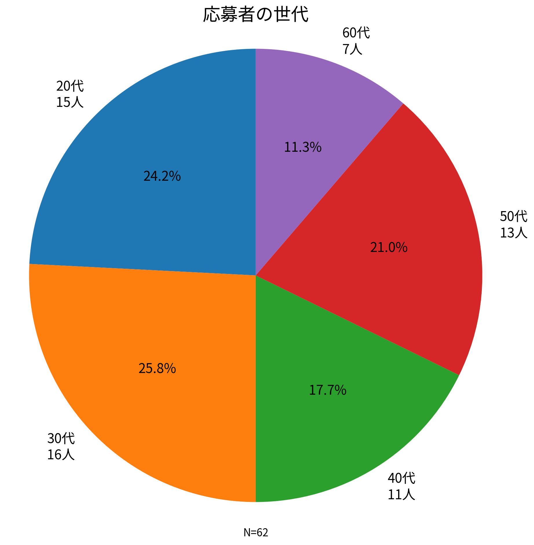 世代別では、30代が25.8%で最も多く、次いで20代が24.2%、50代が21.0%、40代が17.7%、60代が11.3%でした。