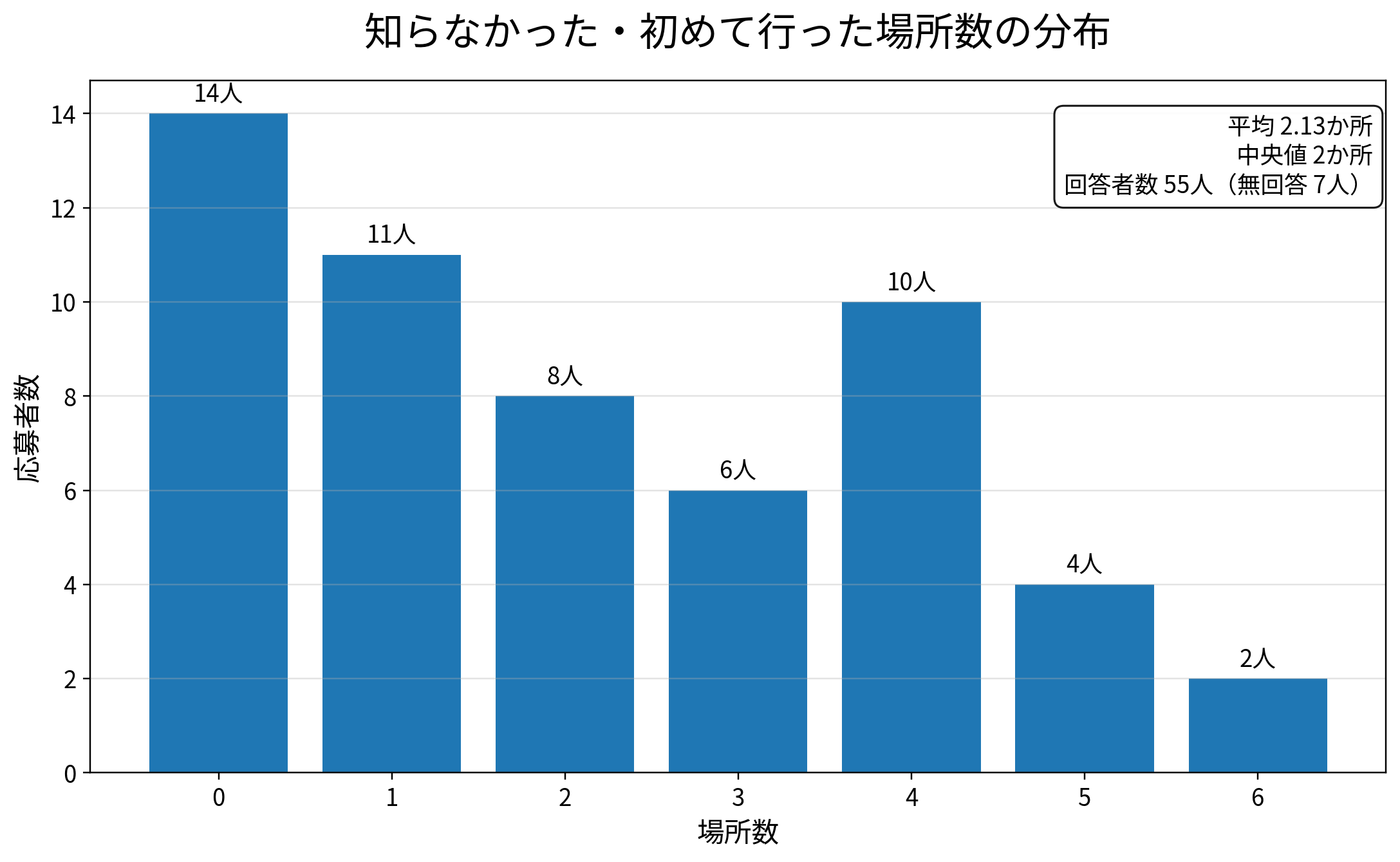応募者に対して、「今回の企画をきっかけに知らなかった・初めて行った場所」がいくつあったかを集計したところ6スポット中、平均値は2.13か所、中央値は2か所でした。