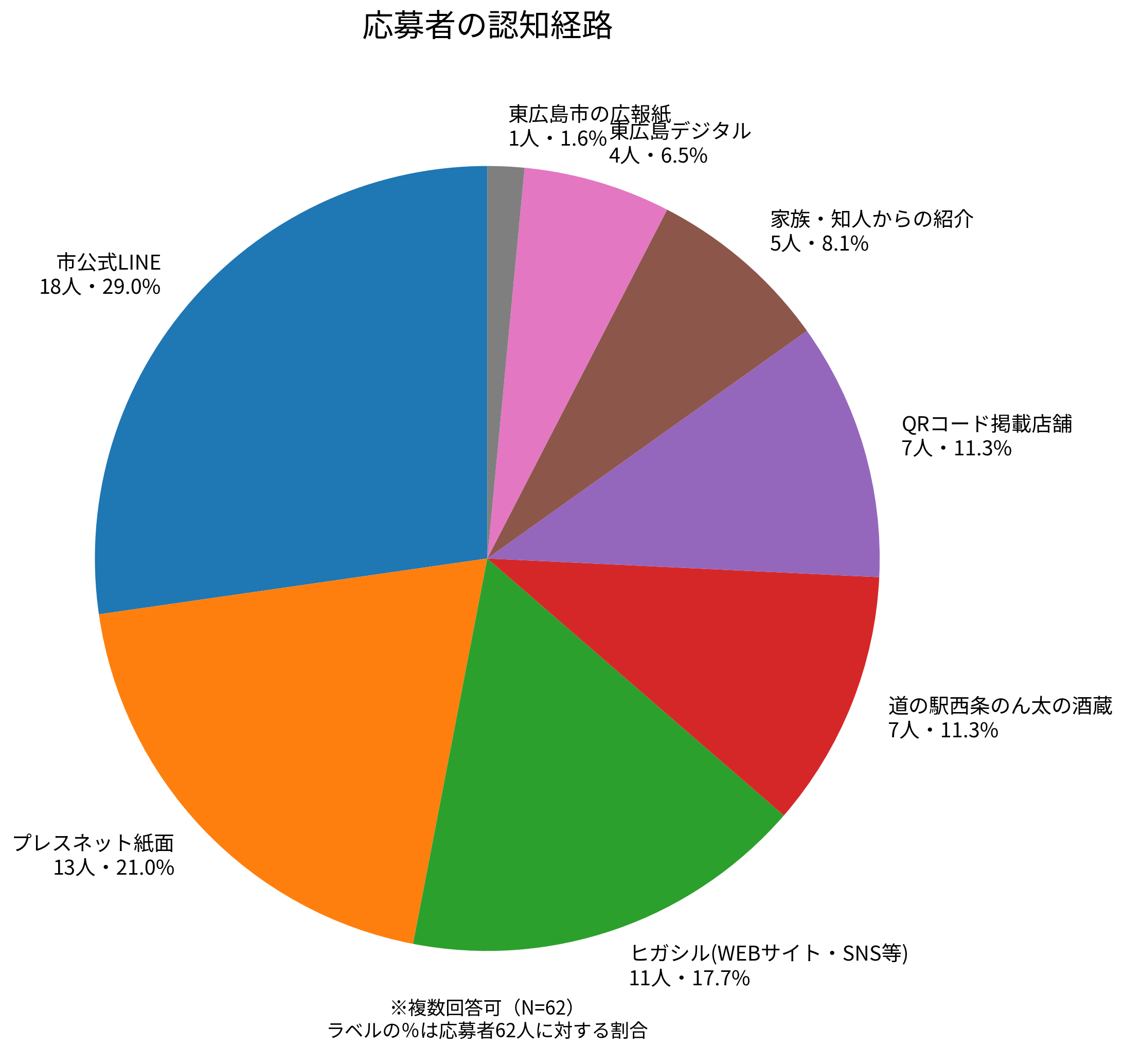 応募者の発地を見ると、東広島市内が48人(77.4%)、東広島市外が14人(22.6%)でした。まずは市内在住者を中心に参加が広がった一方で、市外からの参加も一定数見られ、域内向け施策にとどまらない可能性も確認できました。