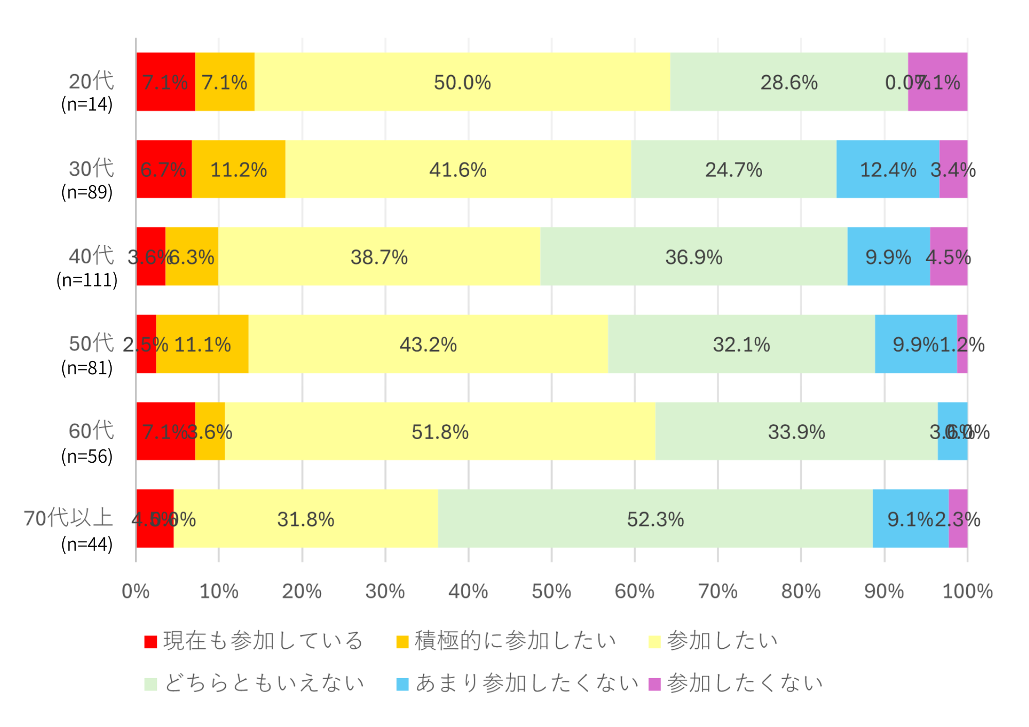 • 60代は「参加したい」(51.8%)が全年代で最も高く、「積極的に参加したい」(3.6%)は控えめとなるが、「現在も参加している」(7.1%)は最も高い割合となる