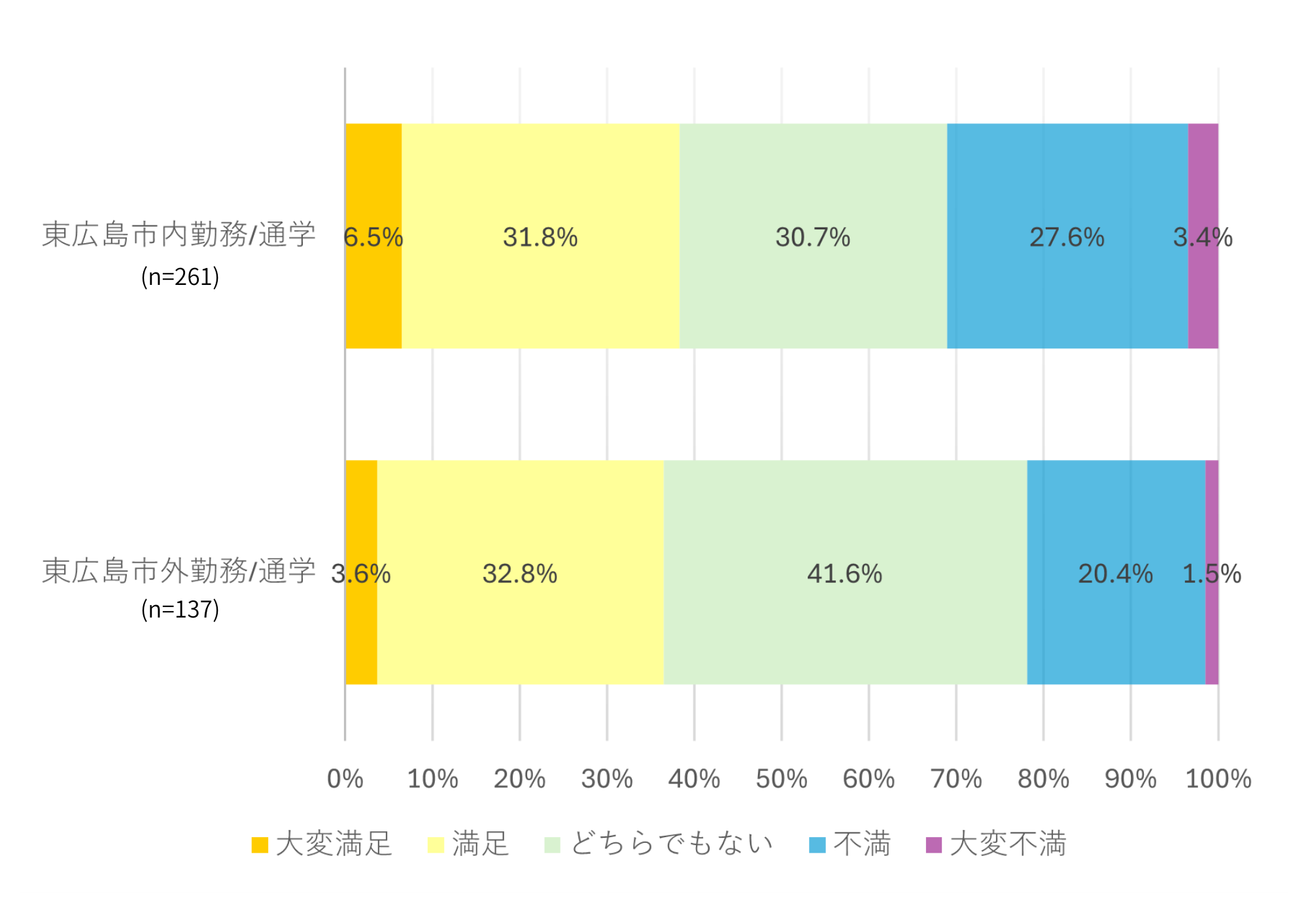 • 「東広島市内勤務/通学」のグループは、「満足・大変満足」が38.3%と全体平均よりやや高い
