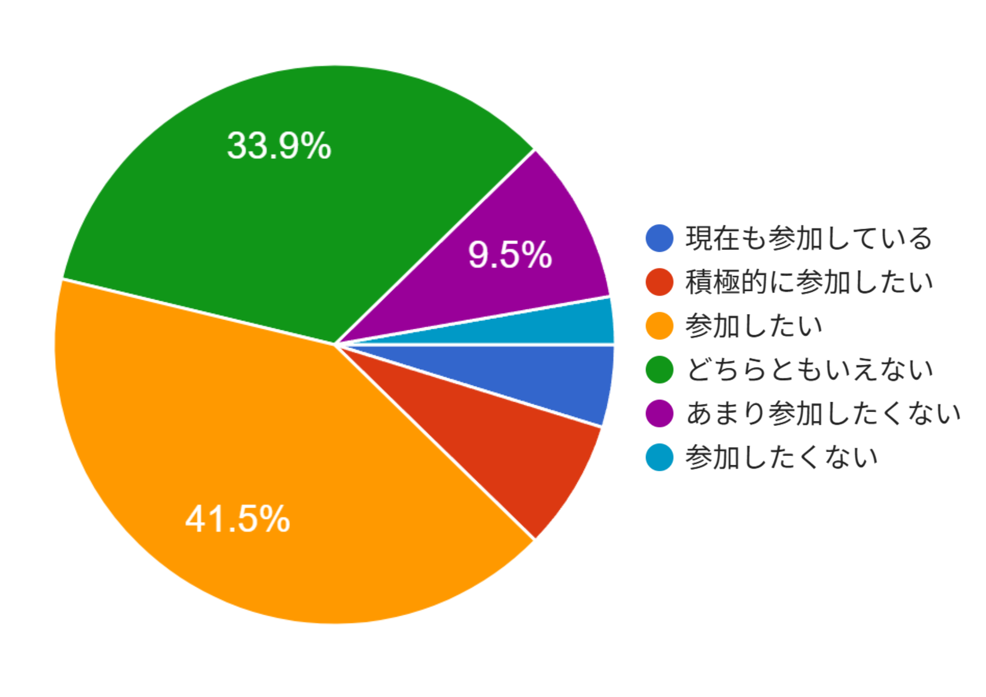 • 「参加したい」(41.5%)と「積極的に参加したい」(7.5%)、そして「現在も参加している」(4.8%)を合わせた「参加意欲あり」層は53.8%と、半数以上を占める