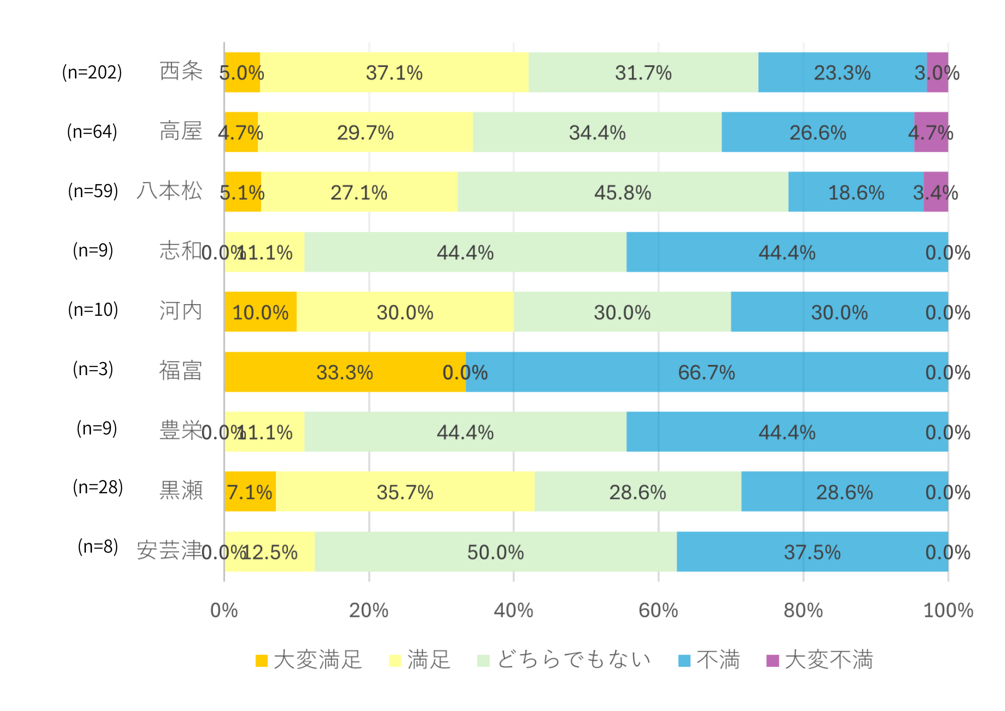 • 「西条」「黒瀬」「河内」では満足・大変満足が約4割と比較的高い水準
