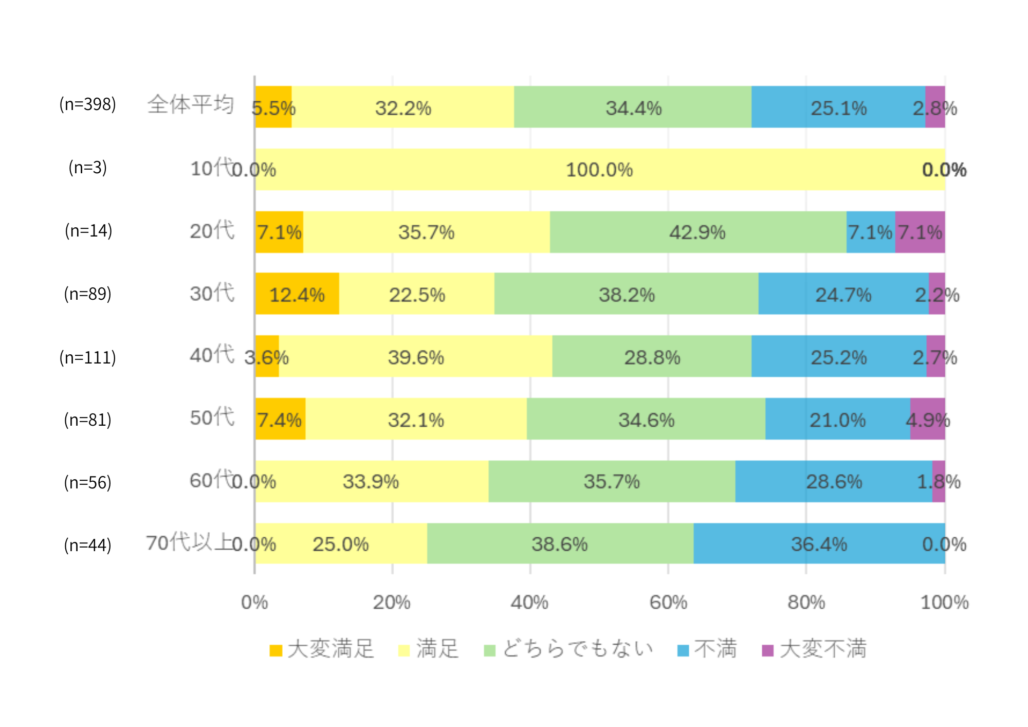 • 一方、70代以上は「満足・大変満足」が25.0%と低く、「不満・大変不満」が36.4%と全年代で最も高い