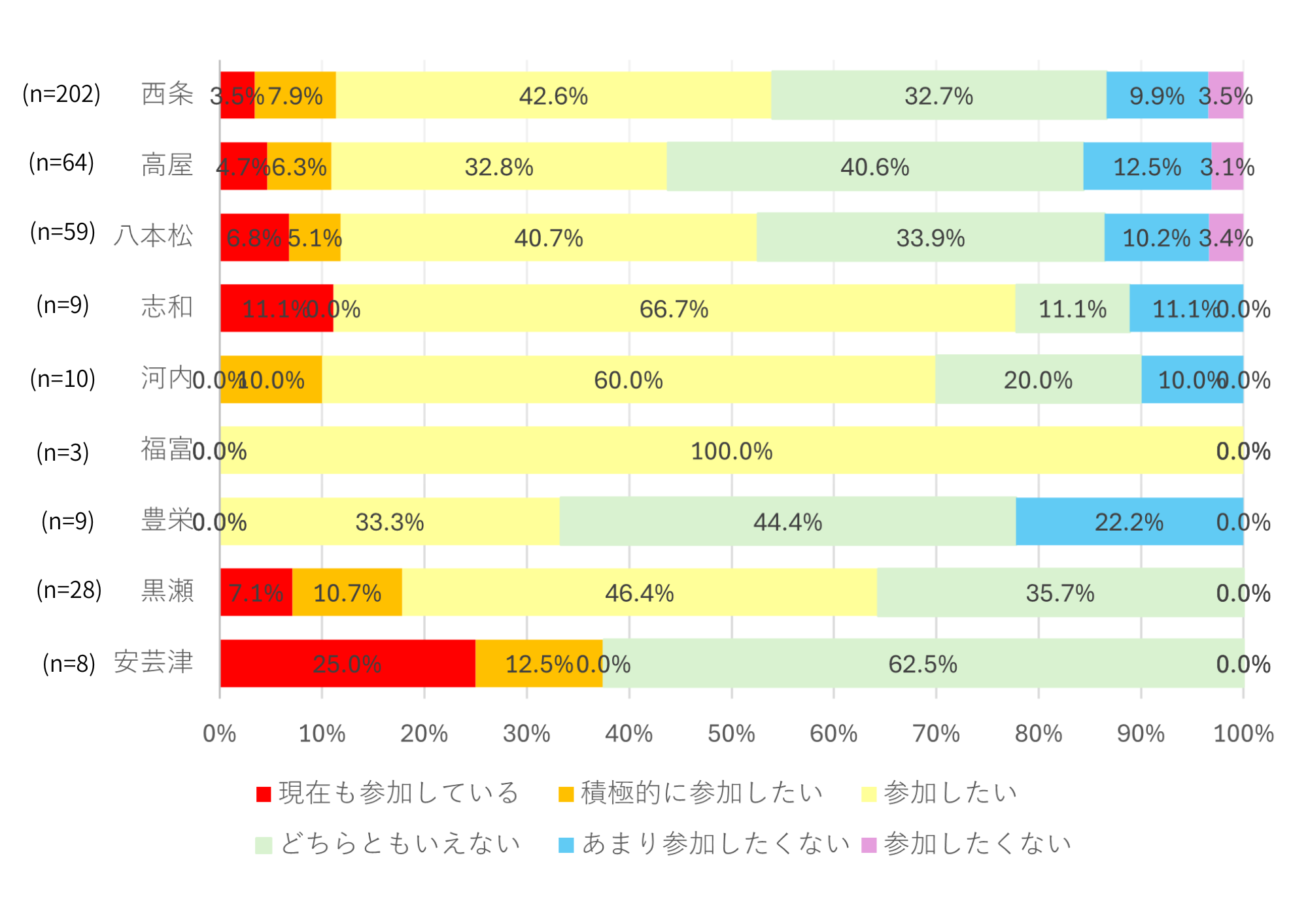 • 安芸津は「現在も参加している」が25.0%と、最も高い割合。一方で「参加したい」は0%、「どちらともいえない」が62.5%と過半数を占め、二極化する傾向にある