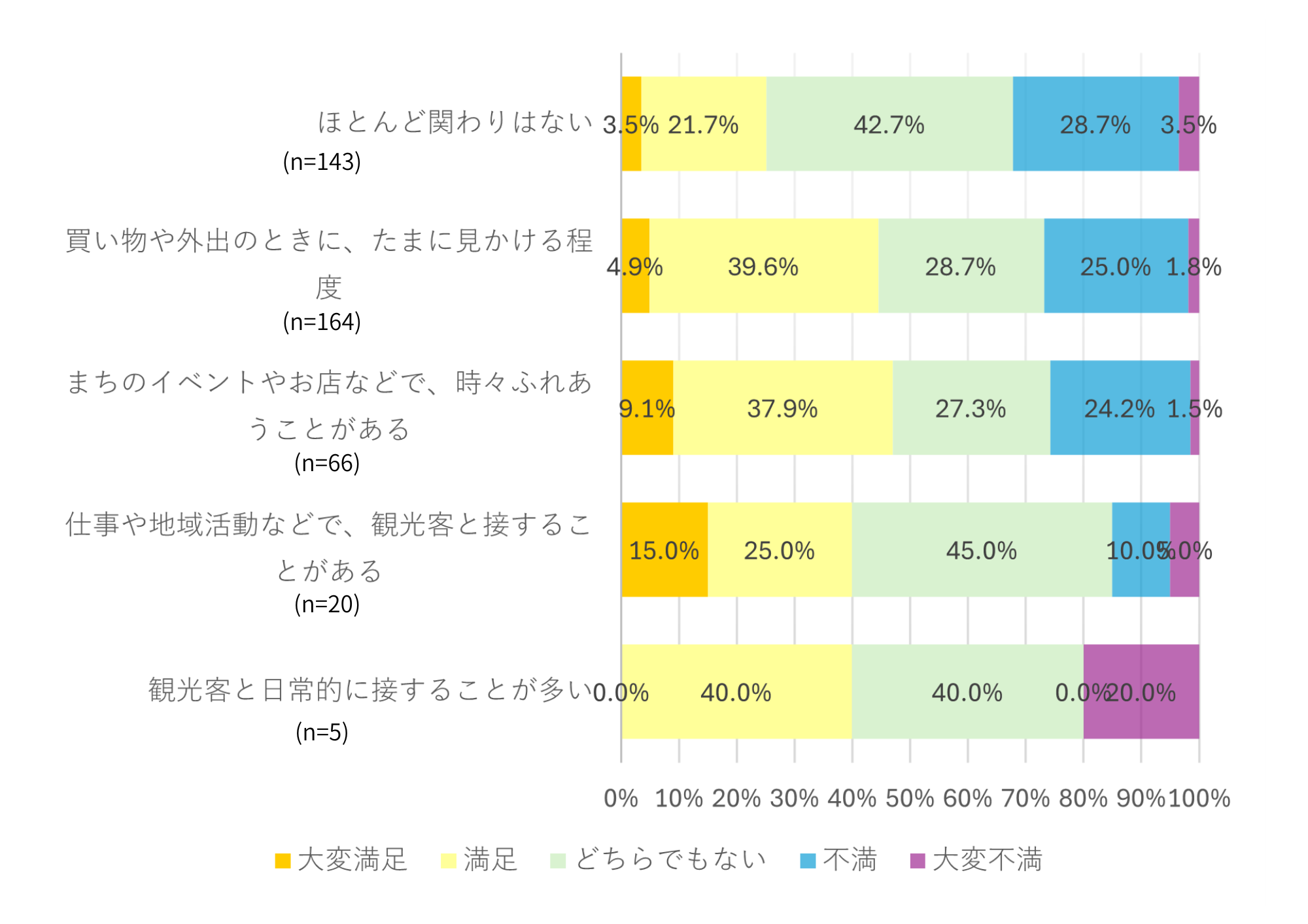 • 一方で、観光客と「ほとんど関わりはない」層の満足度が最も低く(25.2%)、不満度が最も高い(32.2%)