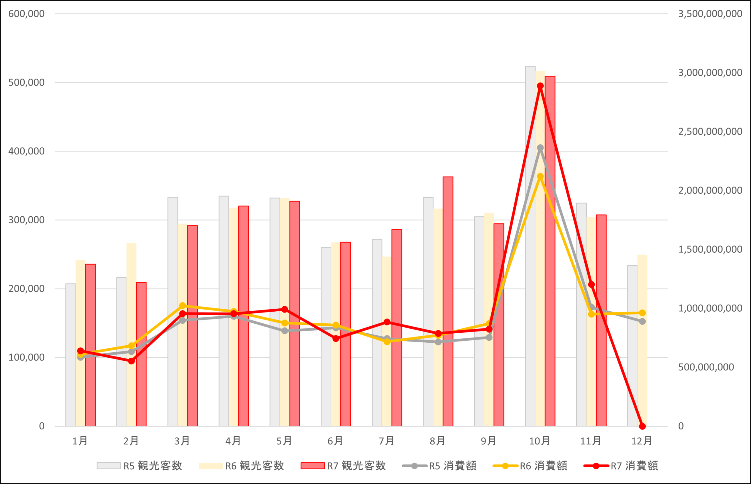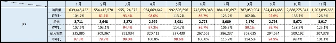 - 平年に比べ気温は同水準であったが降水量が25.5mm/月と少なく(R6:198.0mm 気象庁)、行楽シーズンが雨の影響を受けなかったことにより、観光消費額は単月で酒まつりのある10月に次いで高い値となった。(11月)